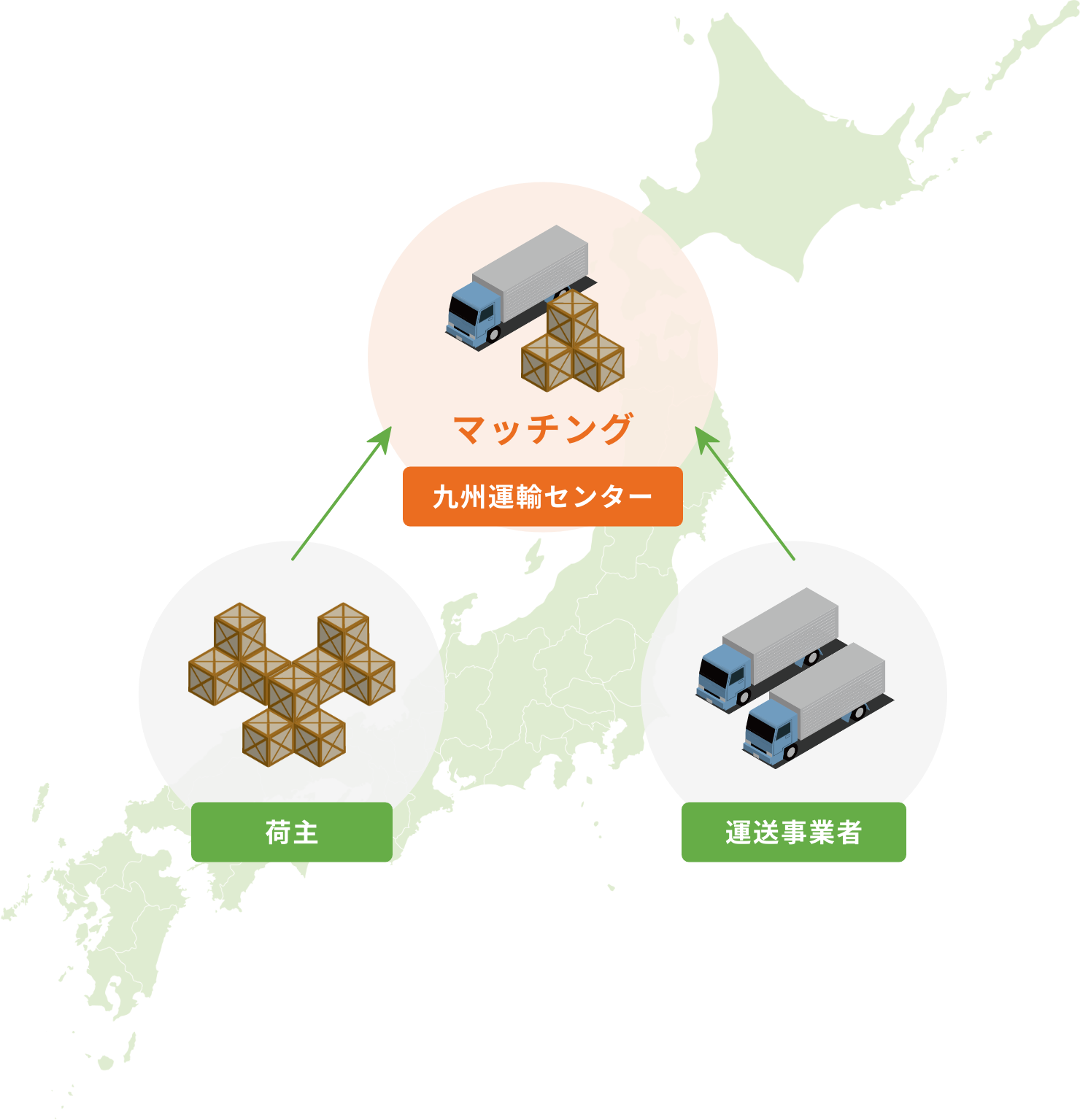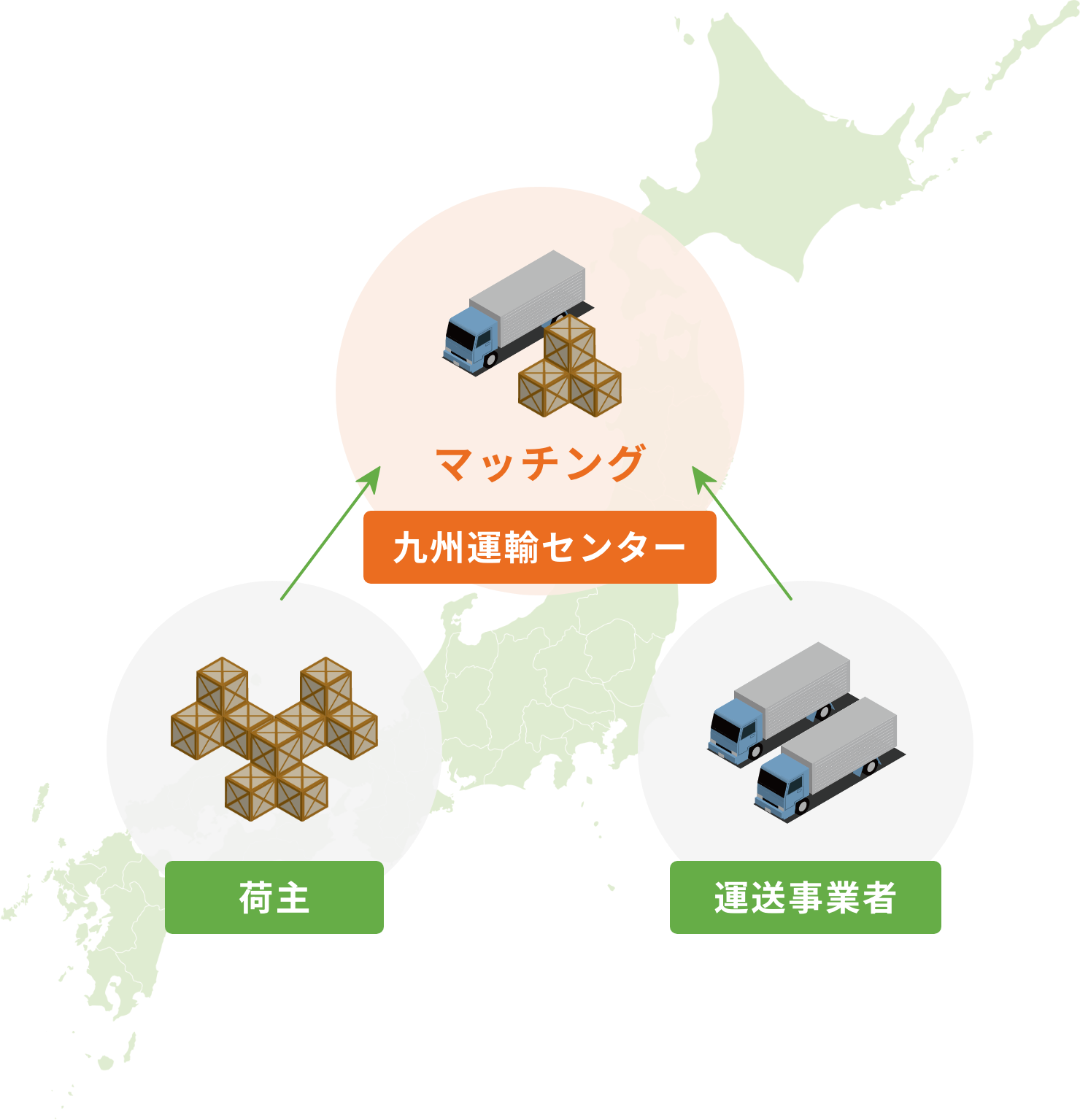 私たちはトラックを自分たちで持たずに、荷物を運んでほしい「荷主」と荷物を運ぶ「運送事業者」をつなぎ、 スムーズな物流を実現する仕組みをつくっています。全国のネットワークを活かし、ヒト以外なら何でも運ぶお手伝いができるのが私たちの強みです。